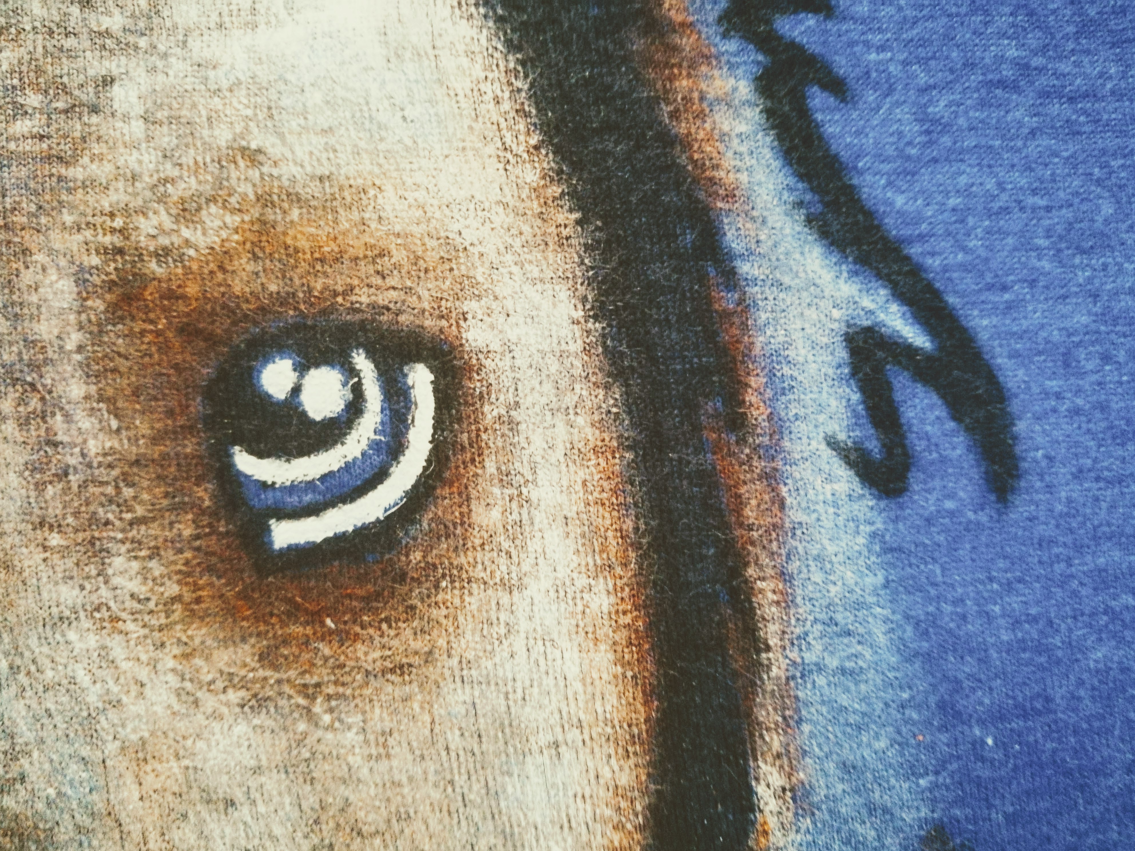 Look at bouncy Tigger lying still and looking at the camera… Yes, you are a good boy! Tigger’s portrait was created using several fabric markers -black, orange and brown – as well as white fabric crayon and paint, over a heather blue tee.