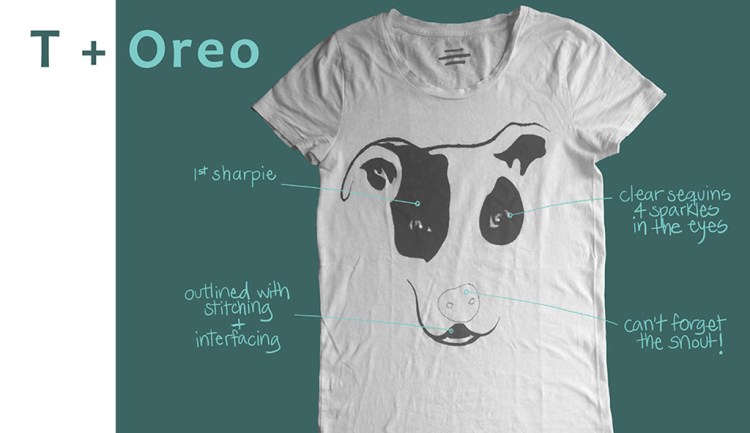 “I just have to get that pretty face on a t-shirt! I look for a blank t-shirt in my closet. The only thing I can find to draw Oreo is a sharpie, but the ink is permanent, right? Plus, my plan is to outline the design with stitching, using pieces of an old tee as interfacing to prevent puckering. Next, to add some spark in the eyes, I get that little bag of spare sequins – I knew someday they would come in handy. For the nose I will use some leftover chambray. And why stop at the nose? I have enough for the sleeves and even a gusset in the center back to narrow the waist and add a little extra room at the hips. Done: T + Oreo!”
