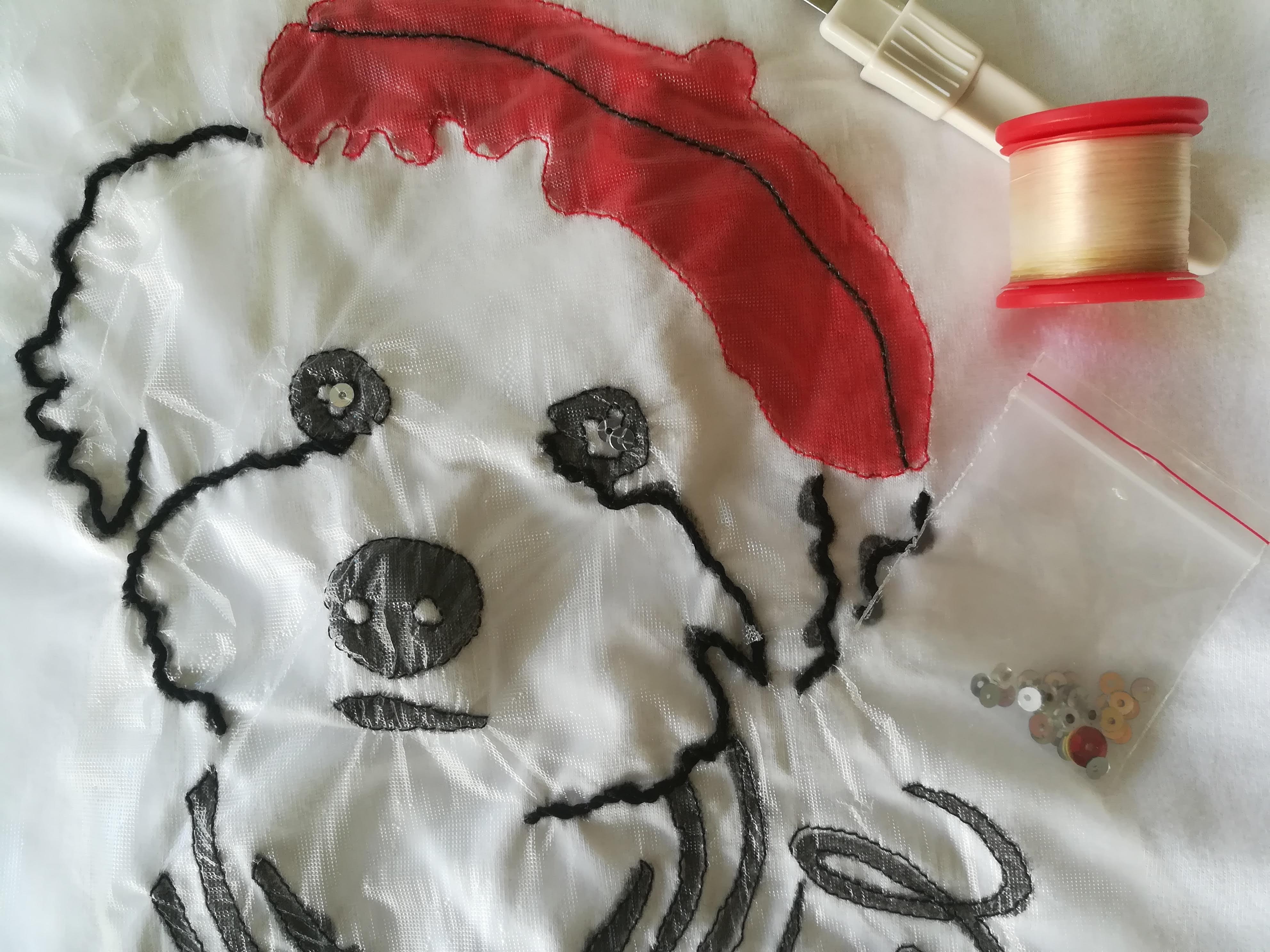 Marcel doesn’t like wearing costumes, he barely tolerates wearing a sweater – and that is only if it is really cold- but doesn’t he look chic? His mom sent me a pic of the glass that served as inspiration and… voilà! Marcel’s curly outline is hand stitched with DMC floss. The rest is done with black and red fabric markers, outlined with black and red stitching over water-solvent interfacing, and the pièce de résistance, a few sequins in those big round eyes. Oh là là Marcel!