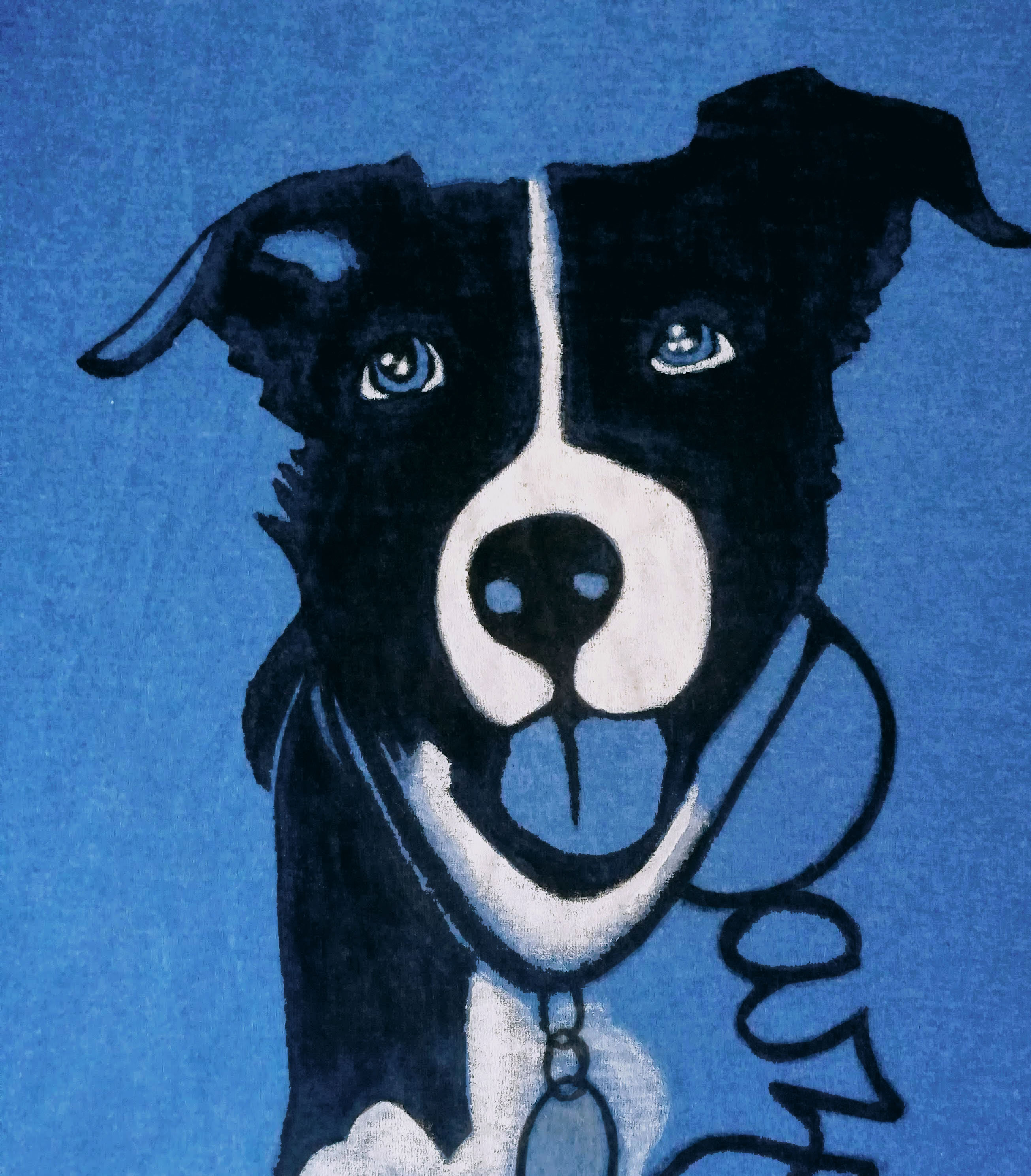 She loves getting up on the bed, but Dazy is anything but lazy! The portrait of this pretty and energetic pup is made on a heather blue t-shirt using black and silver fabric markers, black and white fabric crayons, and white fabric paint.