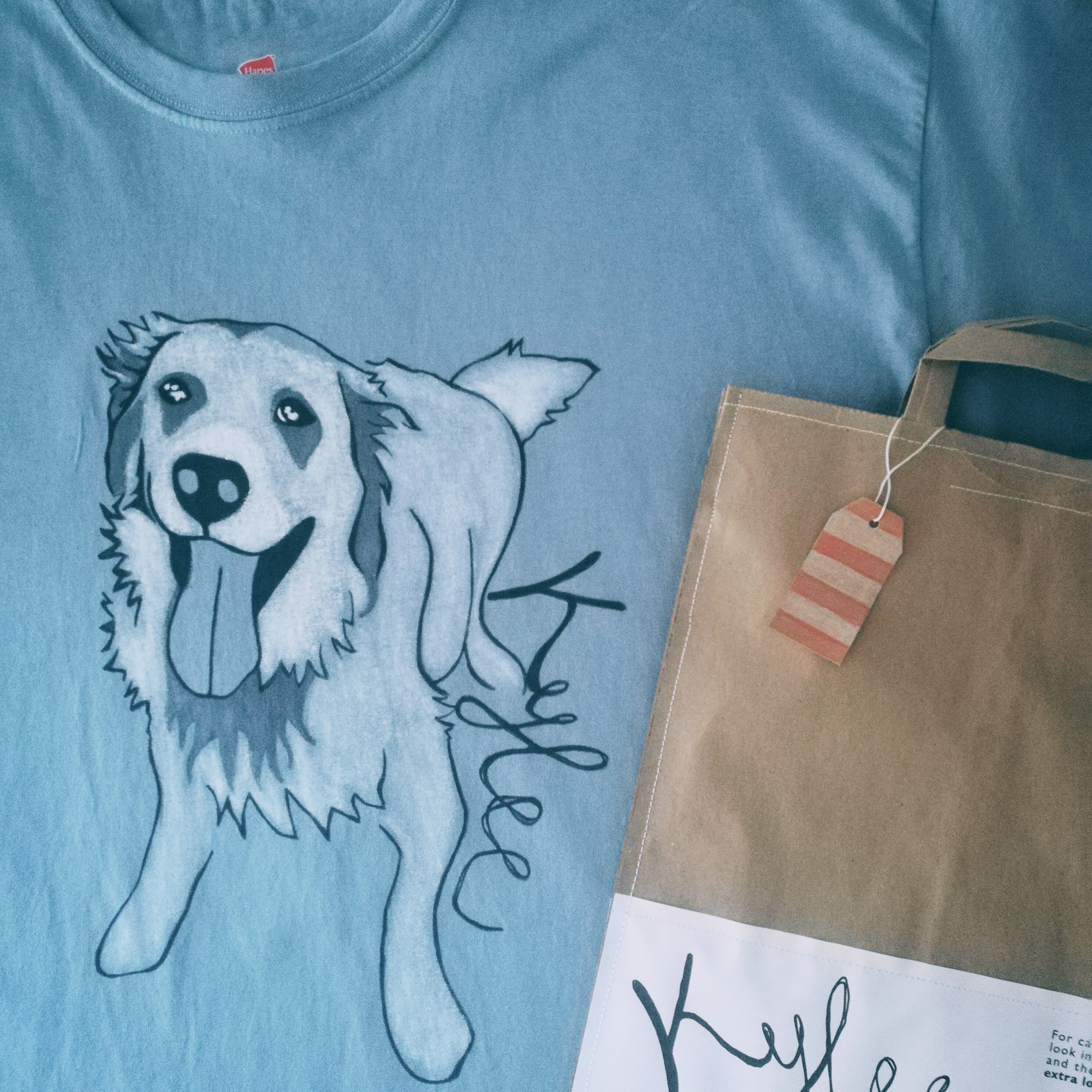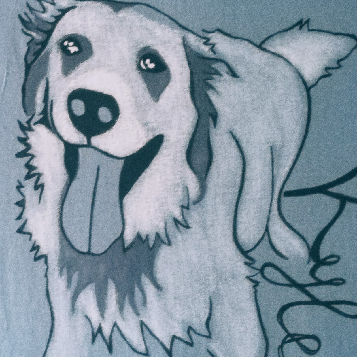 Smiley Kylee is a puppy at heart, always ready to play. Get the frisbee and let’s go! This silly pooch features on a stonewashed blue tee. The portrait is made with black and gray fabric markers in addition to white fabric crayon and paint.