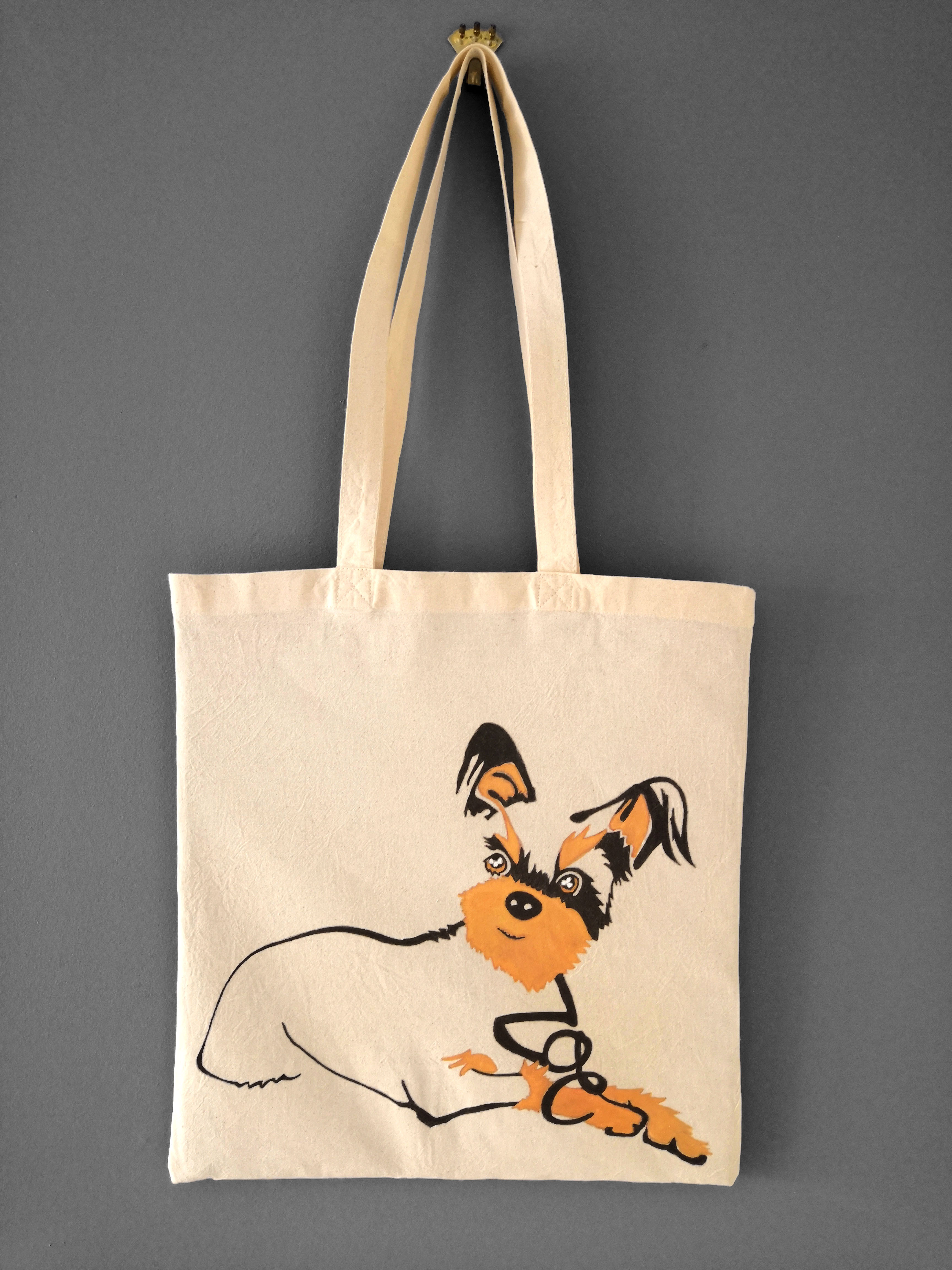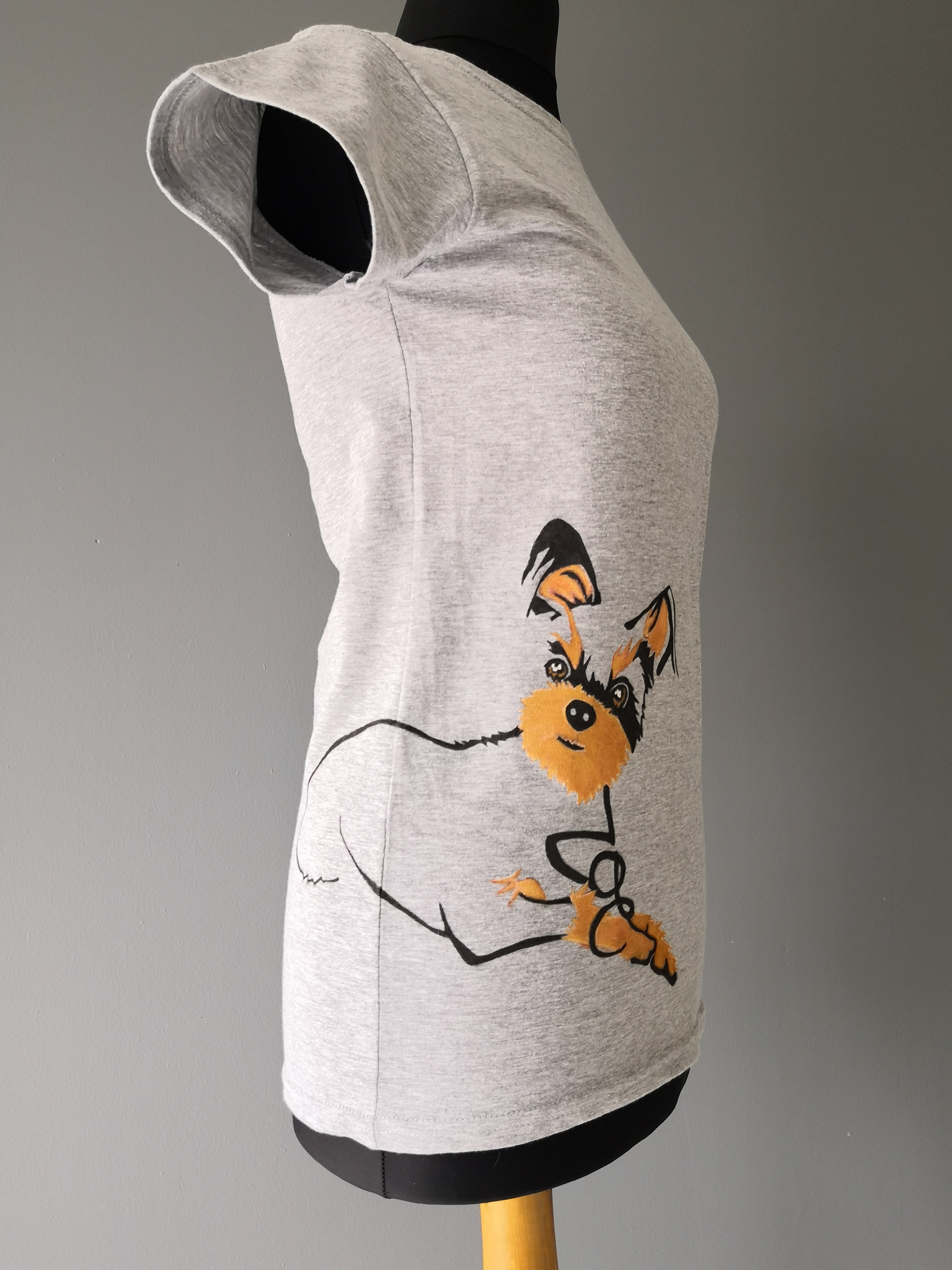 Zoe thinks outside the box and inside the tote! Fearless Zoe explores new places over the side seams of this heather gray t-shirt. Same technique for both the tee, and the eco-friendly canvas tote: I defined the portrait with several markers – black, brown, orange and gold -, then added a dab of white fabric paint to enhance the eyes and add texture to the lighter sections of hair.
